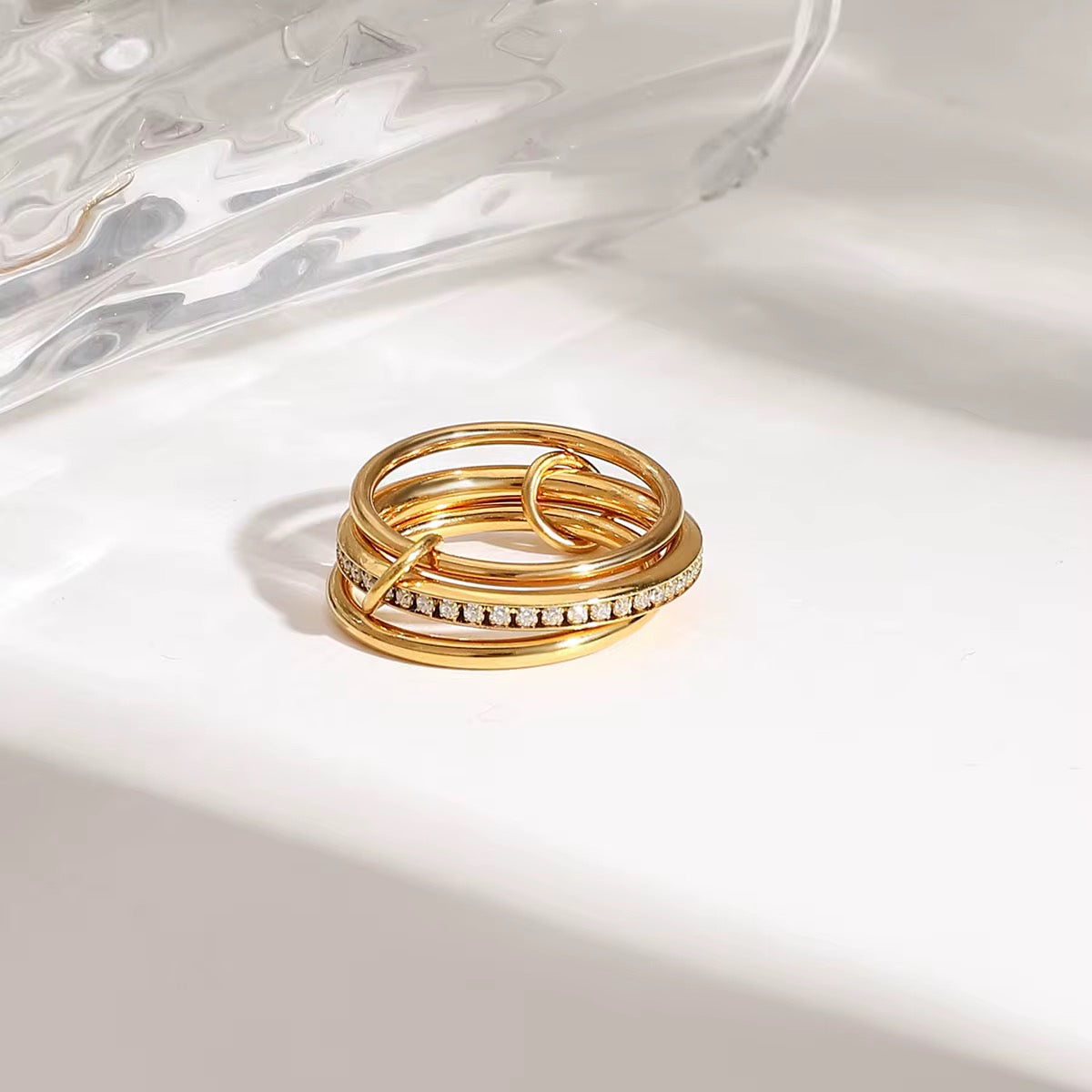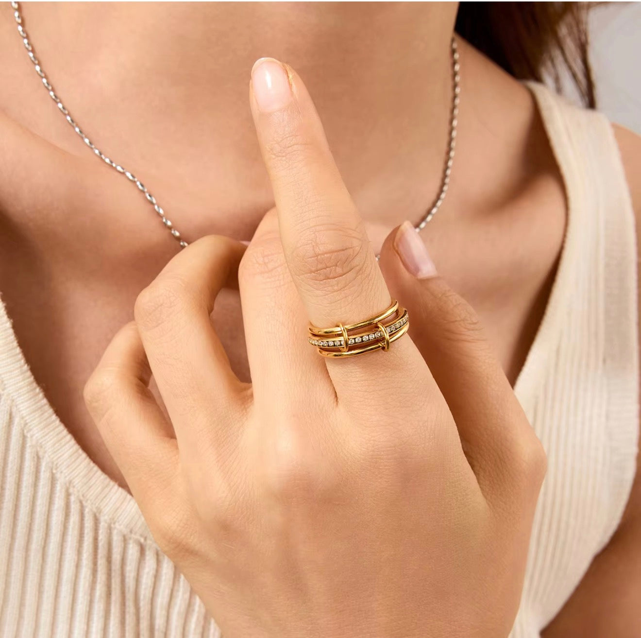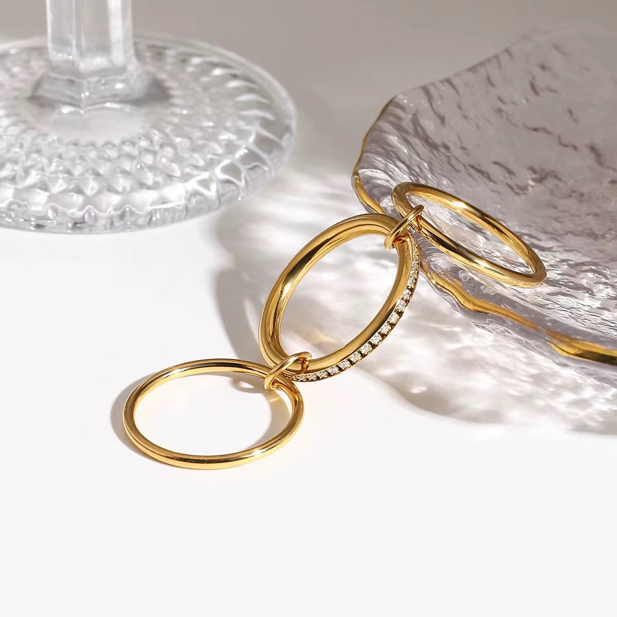 A modern twist on timeless elegance. The Aura Link Ring features three interlocking gold bands, one adorned with lab-grown zircon gems for a touch of refined sparkle. Crafted from premium titanium steel with 18K PVD gold plating, it’s designed for all-day wear, resistant to tarnish and made to shine with you, always.