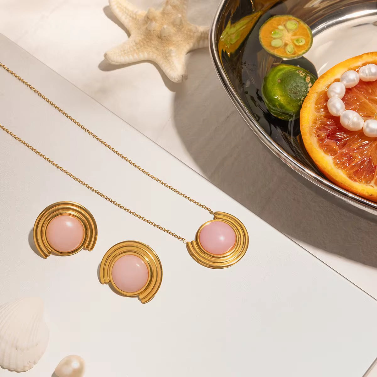 Soft, radiant and effortlessly elegant, the Blush Aurelia Set is designed for lovers of timeless femininity with a modern edge. A smooth blush stone sits at the centre, framed by sculpted gold detailing that adds a warm, luminous glow to any look.