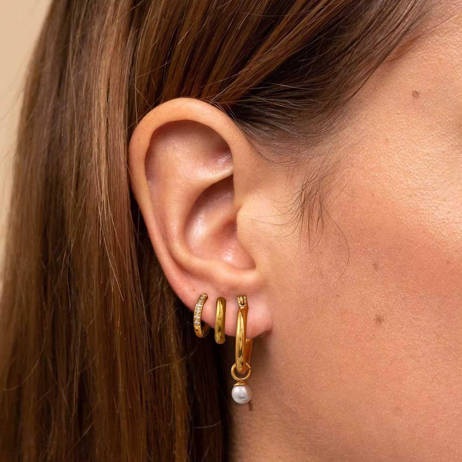 The Celene Hoop Set offers effortless elegance with three distinctive 18K PVD gold-plated stainless-steel designs, from the refined sparkle of zircon hoops, to the smooth glow of classic gold, to the soft radiance of pearl drops.