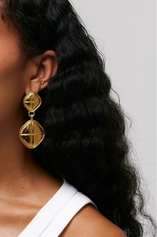 The bold Göe earrings are crafted from stainless steel with a rich 18K PVD gold finish, featuring a striking geometric design. Perfect for making a statement, these earrings add flair to any outfit and showcase your confident style, making them a must-have for fashion enthusiasts.