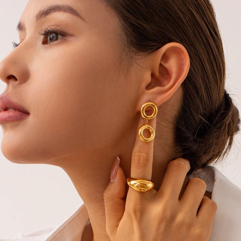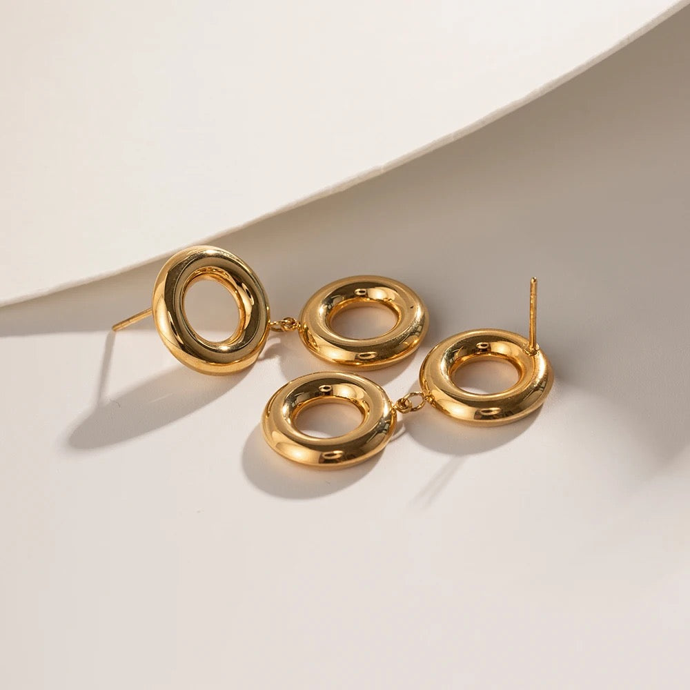 The elegant Hööpsni earrings feature a unique circular design with a luxurious gold finish, crafted from stainless steel with 18K PVD gold plating. Perfect for any occasion, they offer subtle sophistication and timeless charm, making them a versatile addition to your jewellery collection.