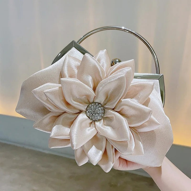 Meet Luna Fleur, the epitome of elegance and charm. This stunning handbag features delicately layered satin petals and a dazzling crystal centerpiece, evoking the beauty of a blooming flower. With its refined metal handle, Luna Fleur is designed for those special occasions where you want to shine. Perfect for weddings, galas, or any event that calls for a touch of romance and sophistication.