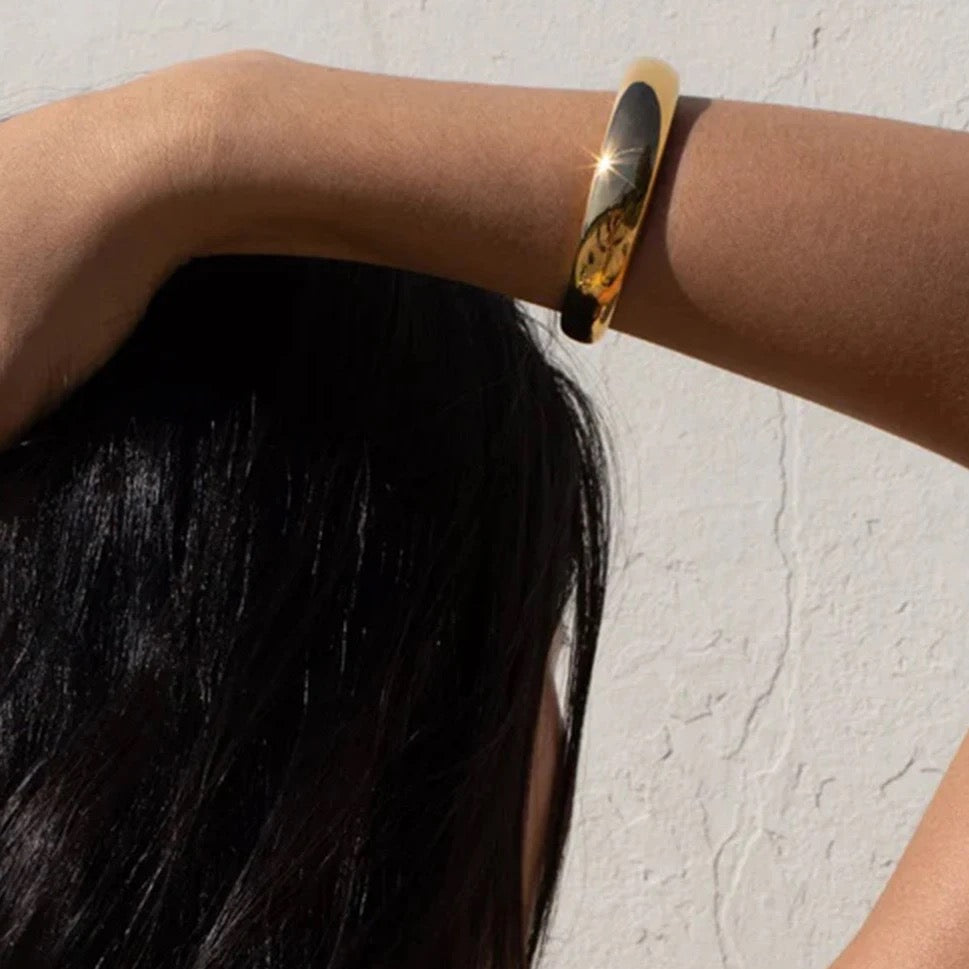 The Solara Bangle is a seamless fusion of elegance and simplicity, crafted from stainless steel with a polished 18K PVD gold-plated finish that radiates a warm, golden glow. Its sleek, minimalist design makes it a versatile accessory, perfect for adding a touch of sophistication to any outfit. Designed for both comfort and style, the Solara Bangle offers timeless appeal that transitions effortlessly from day to night.