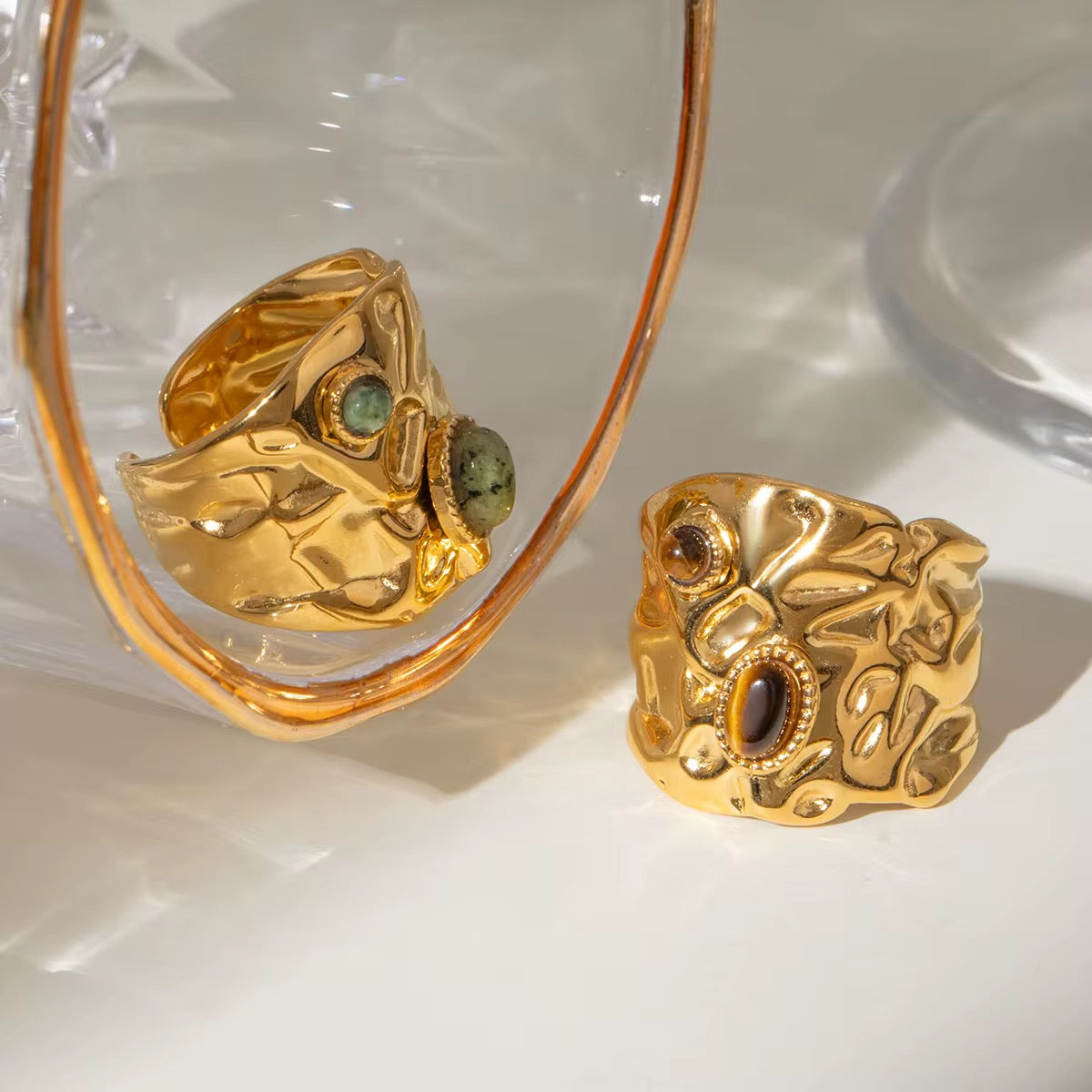 Introducing the Nyajima collection; a radiant tribute to strength and individuality. These sculptural gold rings, set with earthy green and turquoise stones, blend organic textures with luxe finishes. Inspired by natural forms and timeless elegance, each piece makes a statement without saying a word.