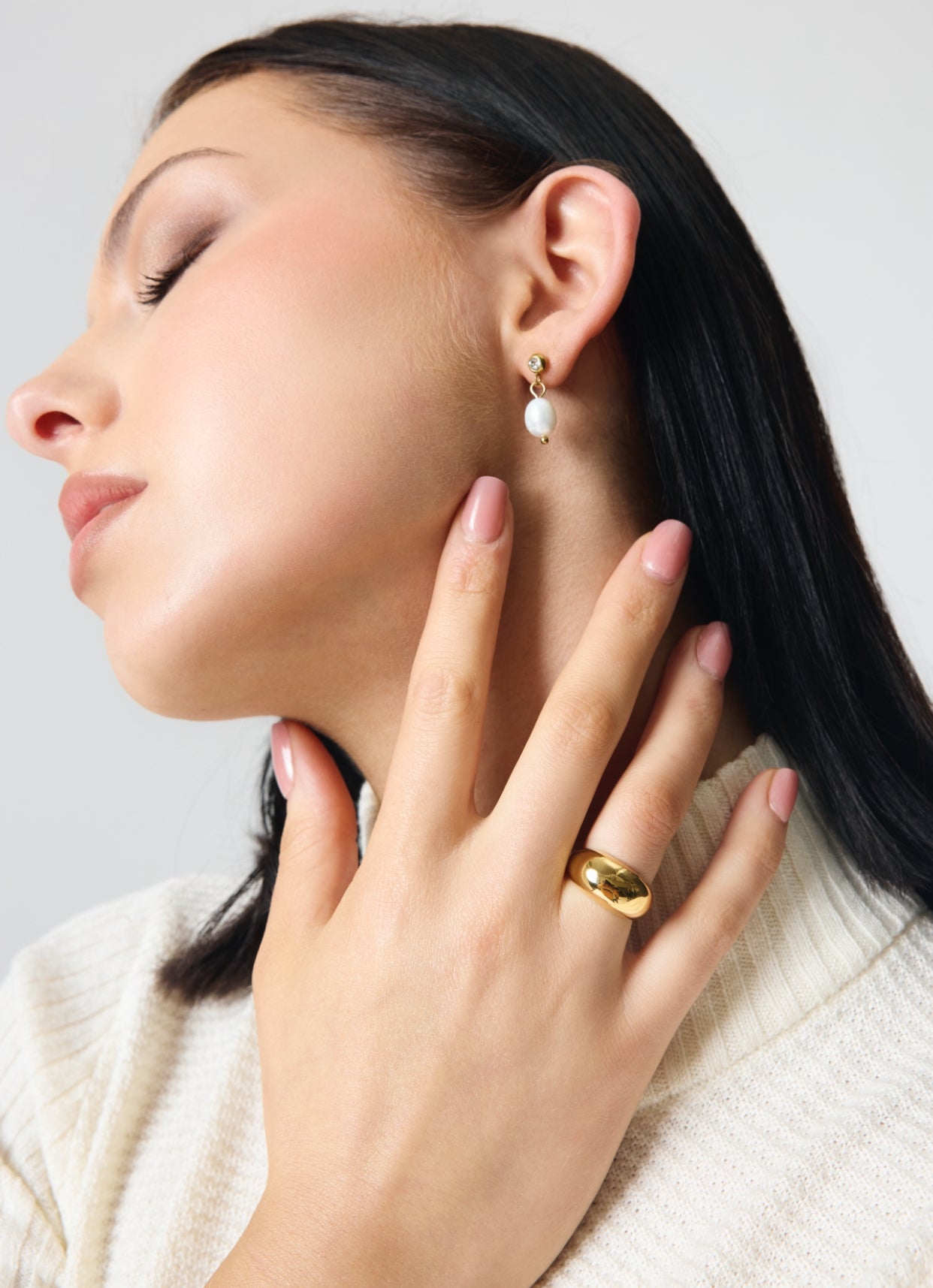 Zämbie Earring. Crafted from durable titanium steel and finished with luxurious 18K PVD gold plating, these earrings feature lustrous imitation pearls suspended beneath sparkling crystal studs. Their minimalist drop design brings a modern twist to a classic silhouette, perfect for both casual wear and special occasions. Lightweight, hypoallergenic, and made to last, the Zämbie Earring is your go-to piece for effortless sophistication.